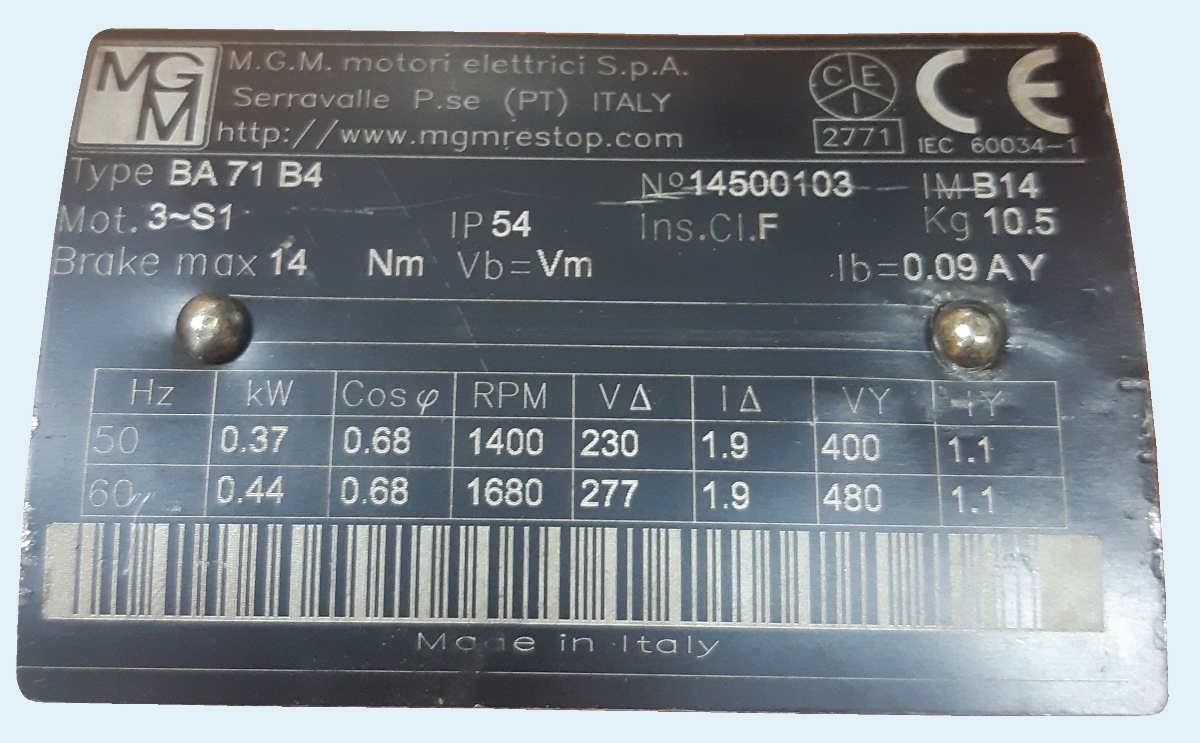 - застаріле IE1 Type BA71B4 mot.3~S1 IP54, Brake max 14 Nm, ins CL.F 50 Hz - 0.37 kW - 1400 rpm