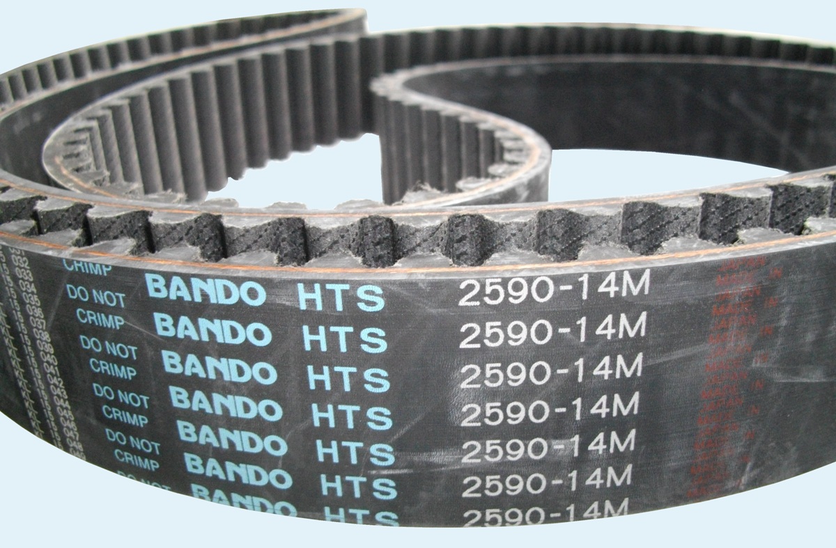 Приводные ремни HTS 2590 14M производства Bando, Япония имеют стекловолоконный корд, наполнение из резины и защитное покрытие зуба тканью. Длина ремня составляет 2590 мм, 185 зубов с шагом 14 мм. Ширина, как правило, выбирается под стандартную рабочую ширину шкивов - 40, 55, 85, 115, 170 мм, но, можно изготовить и другие варианты.